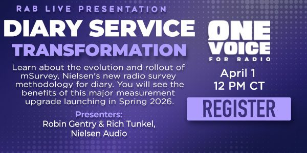 The next RAB live presentation, Diary Service Transformation, is Wednesday, April 1, 2026, at 1PM. Pre-registration is required. In this session, you’ll learn about the evolution and rollout of mSurvey, Nielsen’s new radio survey methodology for diary. You will see the benefits of this major measurement upgrade launching in Spring 2026. The presenters are Robin Gentry & Rich Tunkel of Nielsen Audio.